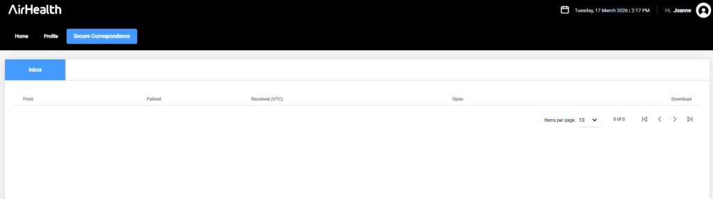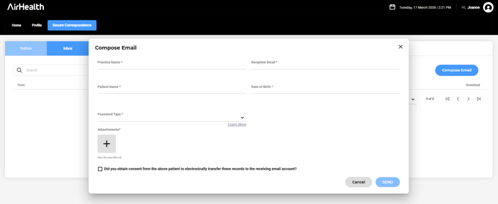 To send an email, access Secure Correspondence tab at the top menu in your online practice portal